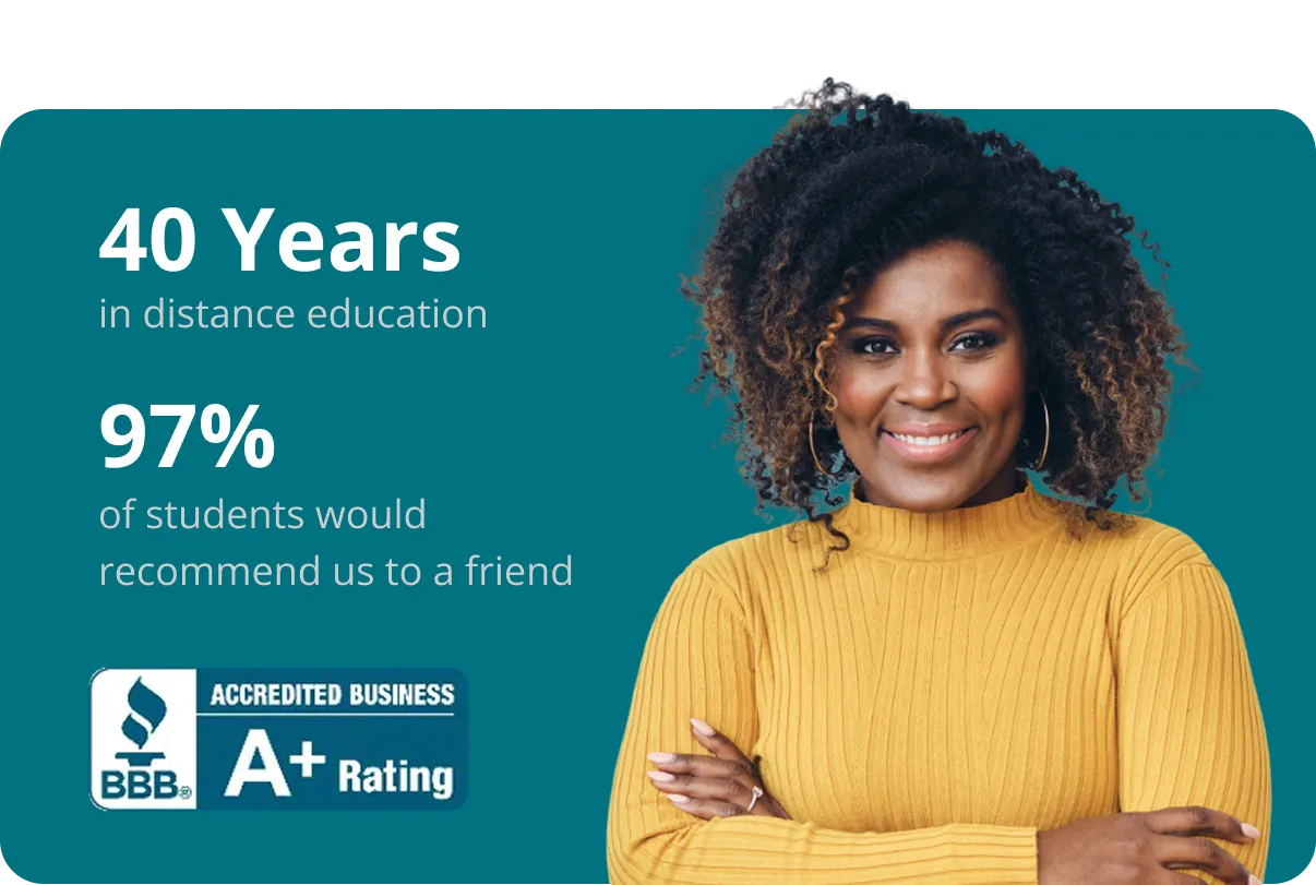 A+ BBB Rating, 40 Years in distance education, 97% of students would recommend us to a friend.